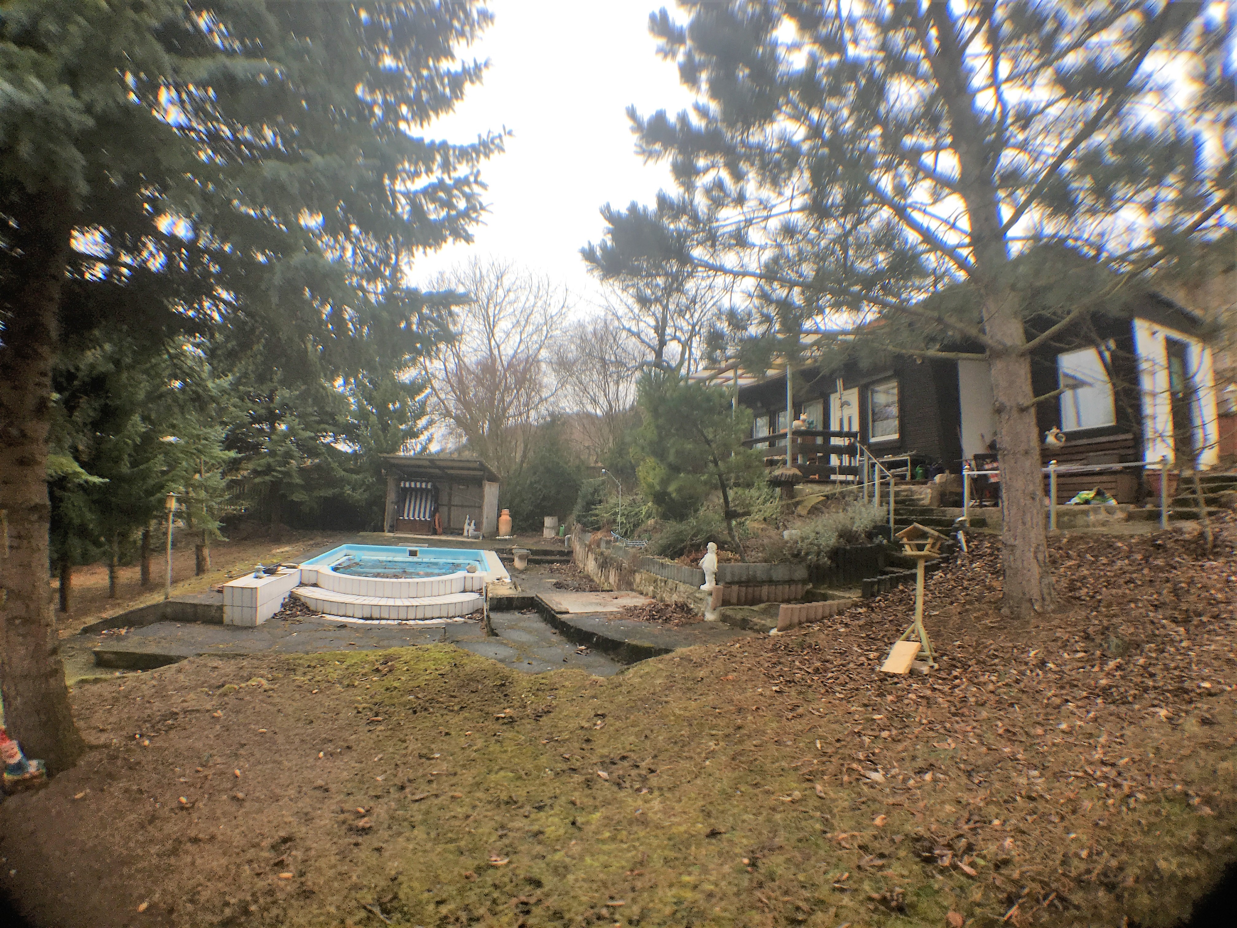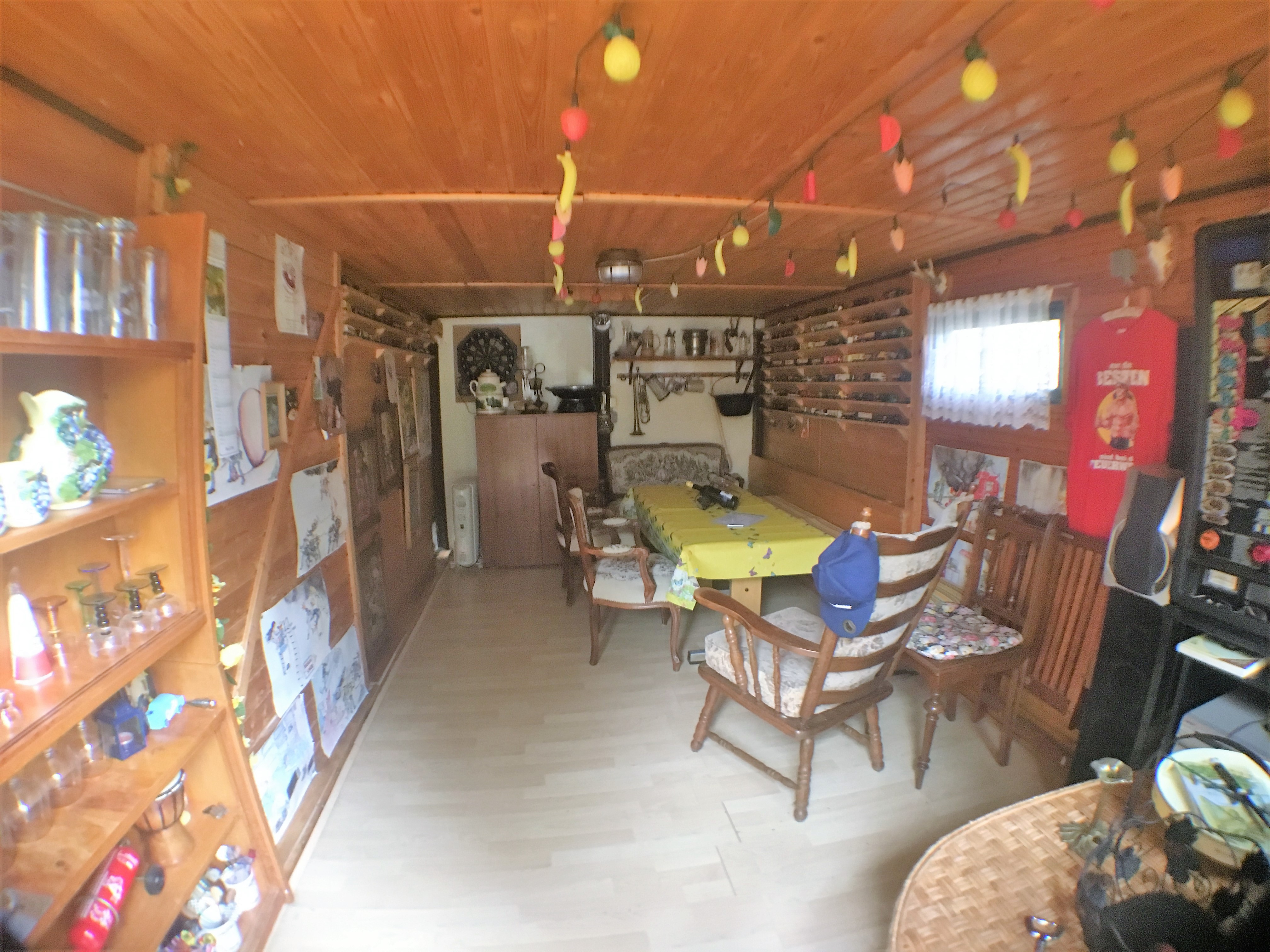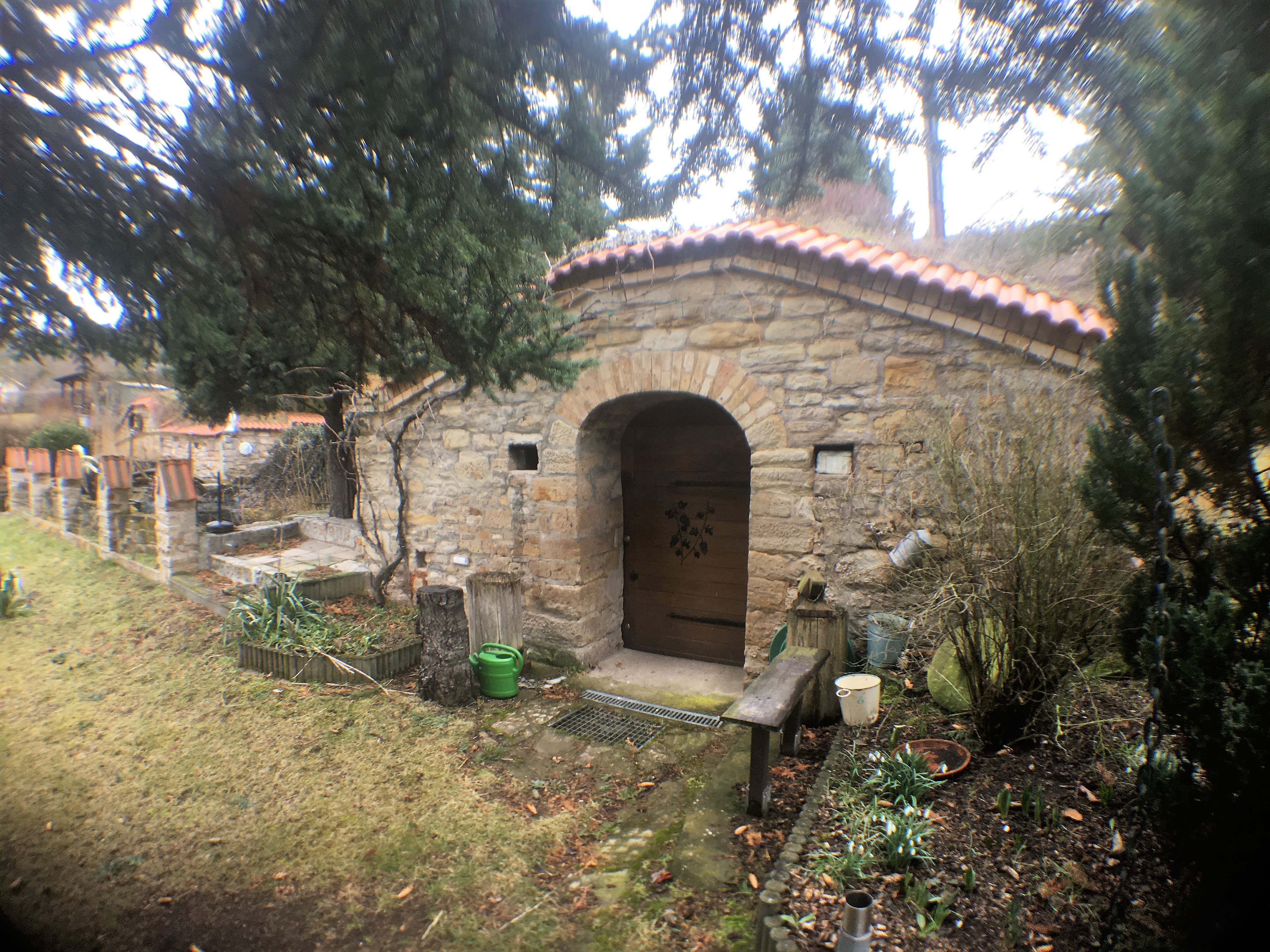 Das Gesamtgrundstück ist 3geteilt in einen Schmuck- und Erholungsgarten, einen Weinberg und Brachland. Es ist bebaut mit 2 urigen Weinberghütten, Wohnbungalow mit Terrasse, Pool 5×3,5×1,6, Carport, Party-Hütte, Grillterrasse und einem Goldfischteich. In einer der Weinberghütten wird selbst gekeltert, gelagert, gefeiert und an Gäste ausgeschenkt.