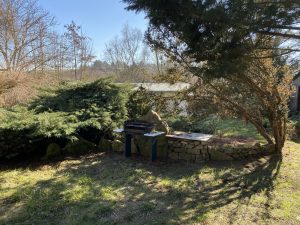 Das Grundstück besteht zu etwa ¾ aus einer Wiese, die mit Obstbäumen bepflanzt werden könnte und zu ¼ als Erholungsfläche mit Bungalow, Gerätehaus, Grillecke und Pool. Die Erholungsfläche wird beschattet durch mehrere Nadelgehölze.